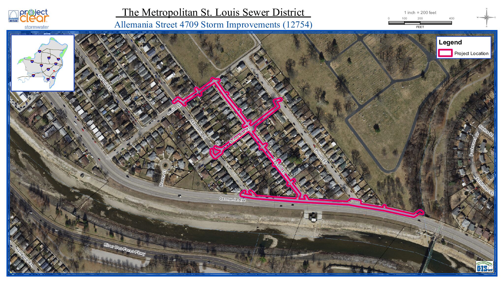 Traffic and Access: As much of the construction will take place in the street, lane closures are anticipated on the following streets: Tesson Street, Allemania Street, Germania Street, Schroeder Place and Stolle Street. MSD Project Clear will maintain at least one lane of traffic at all times or otherwise provide detour routes to allow residents to enter and exit.