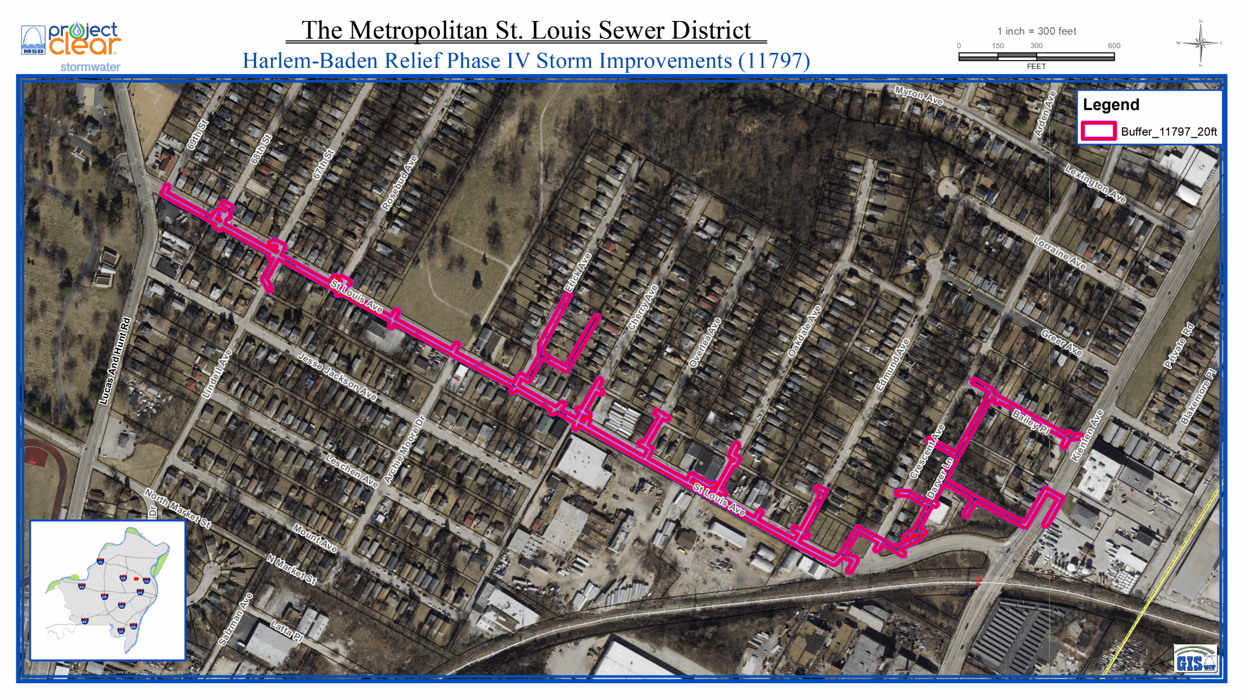 Traffic and Access: As much of the construction will take place in streets, residents should expect temporary lane closures on St. Louis Avenue, Darver Lane, Crescent Avenue, Erick Avenue and other light impacts on streets that intersect with St. Louis Avenue. MSD Project Clear will maintain at least one lane of traffic at all times to allow residents to enter and exit.