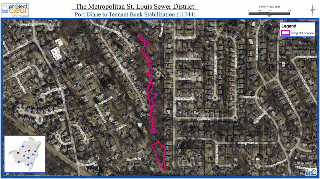 As part of the Stormwater Capital Program established by voter approval of Proposition S in 2024, MSD Project Clear is designing a project to construct approximately 1,500 feet of creek bank stabilization and replace approximately 300 feet of stormwater sewers and approximately 200 feet of wastewater sewers in unincorporated St. Louis County.
